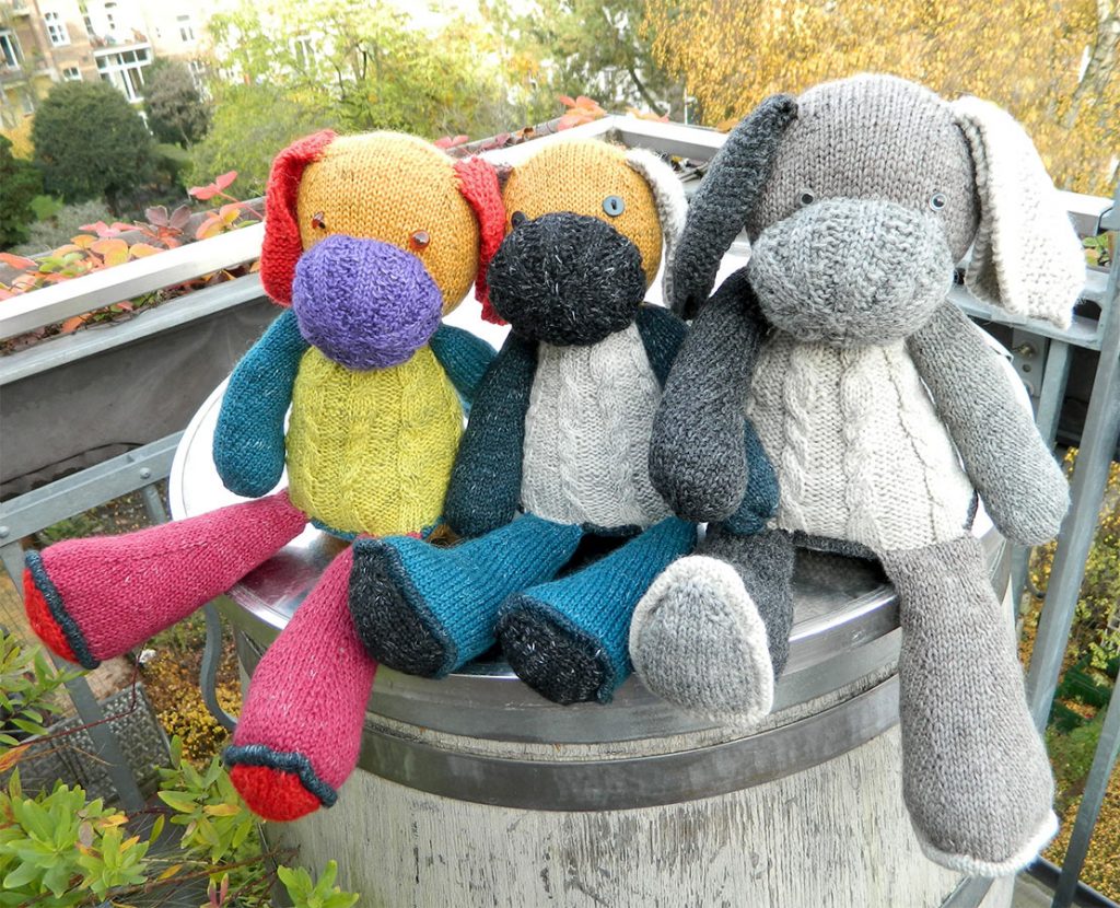 Alle 4 abgebildeten Tiere sind nach der gleichen Anleitung gestrickt, die unterschiedlichen Größen ergeben sich durch die Wahl des Garns und der Nadelstärke.