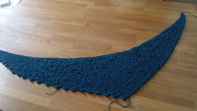 Hier das komplette fertige Stück. Es besteht aus 2 Schritten: erst wird das Zackenrandtuch gestrickt. Und weil ich die spitzen Zipfel nicht mag habe ich an die lange Seite noch eine Borte gesetzt.